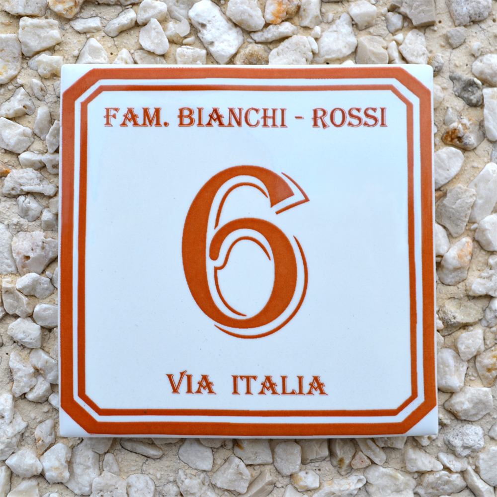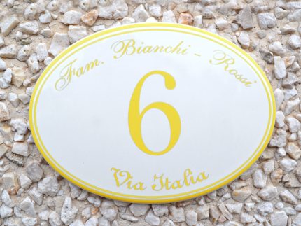 Numero civico esterno in ceramica personalizzata, elegante e resistente nel tempo.