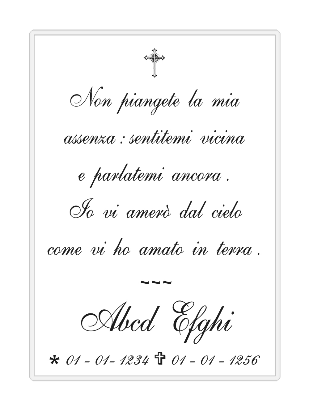 Indica la data di morte della persona cara. Verrà riportata fedelmente sul prodotto, quindi verifica che sia corretta.